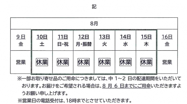 さて、誠に勝手ながら弊社の夏季期間の休業を、以下の通りとさせていただきます。