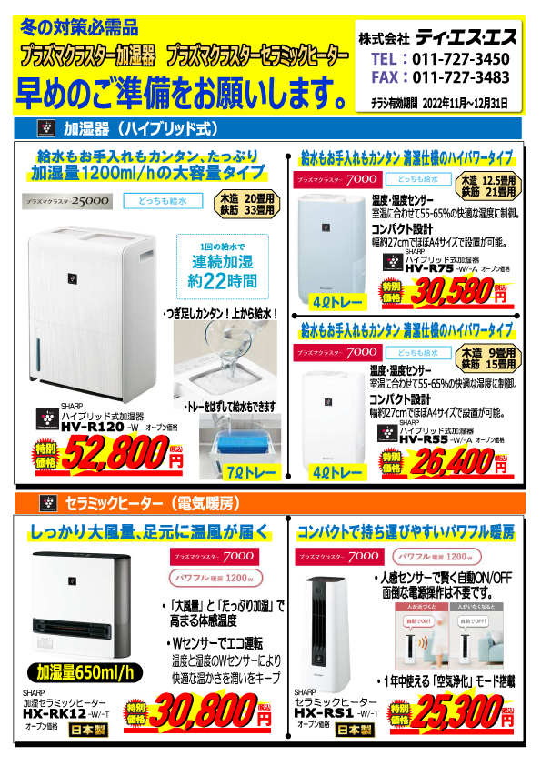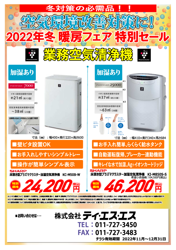2022年12月までの特別セールとして空気清浄機、加湿器、電気暖房のご案内をしております。